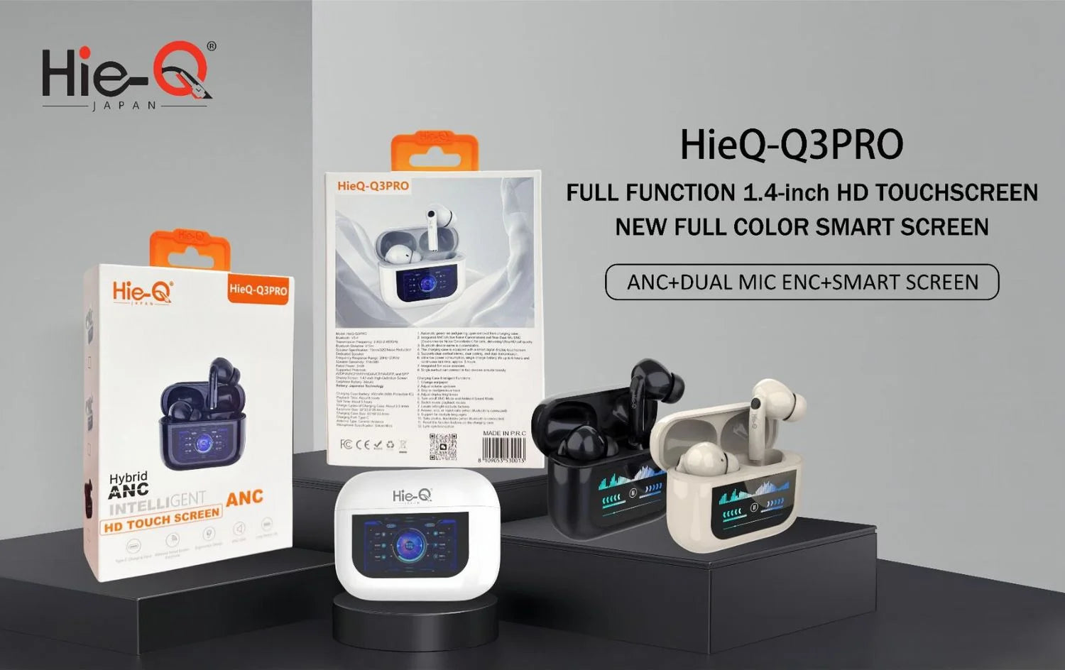 HIE-Q Q3 PRO Wireless Earbuds | 1.4 Inch HD Touchscreen | New Full-Color Smart Screen | ANC + Dual Mic | ENC | 1-Year Warranty